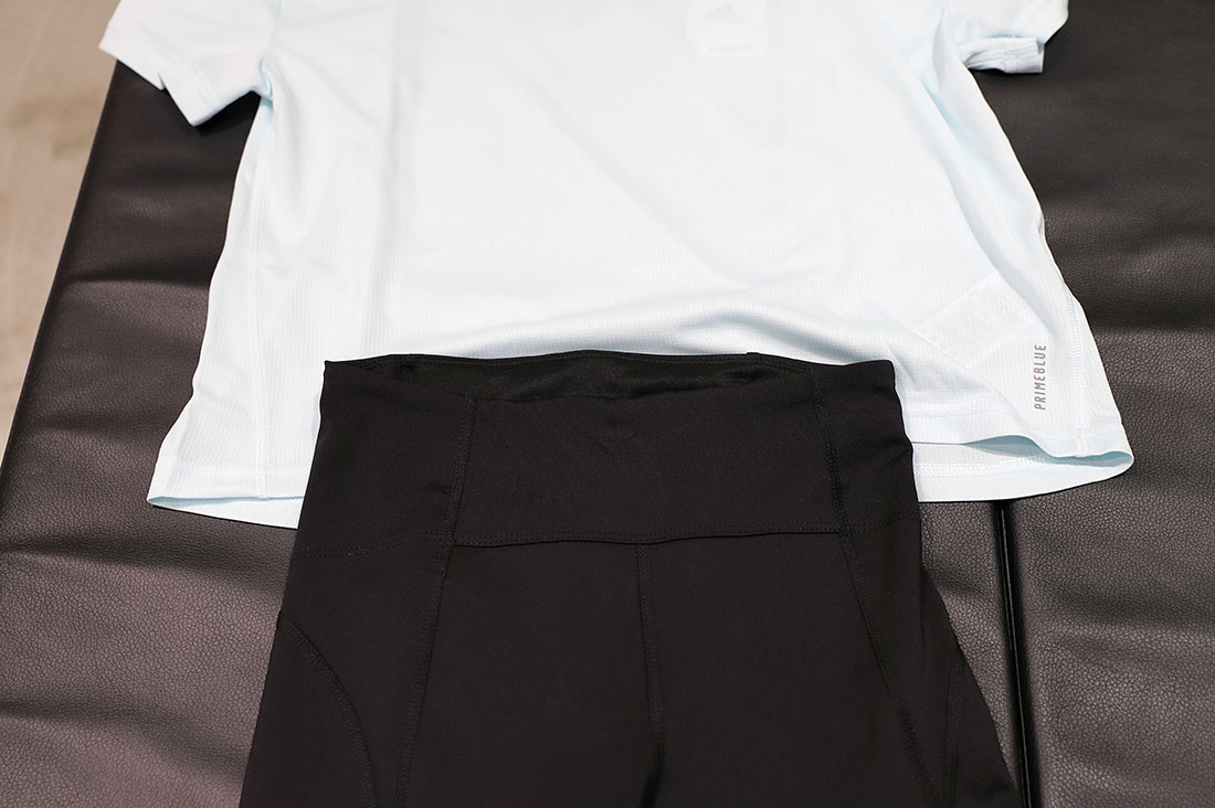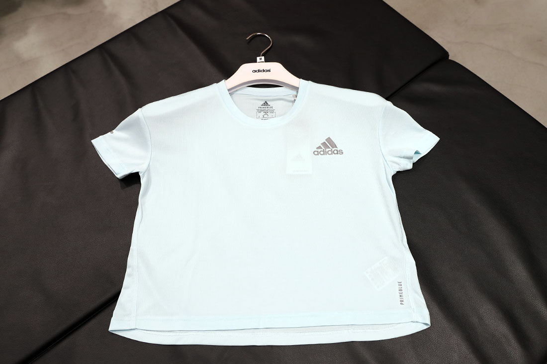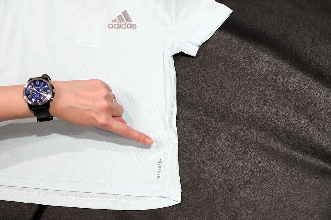 「そのご希望、すべて叶えましょう」と真鍋さんが提案くださったウェアがこちら。ランニングウェアのPrimeblueシリーズからトップスが登場。Primeblueシリーズとは製品素材にリサイクル素材が40%以上使用されているシリーズなんです。すっごく絶妙で涼しげなブルーカラーに目が釘付け♪