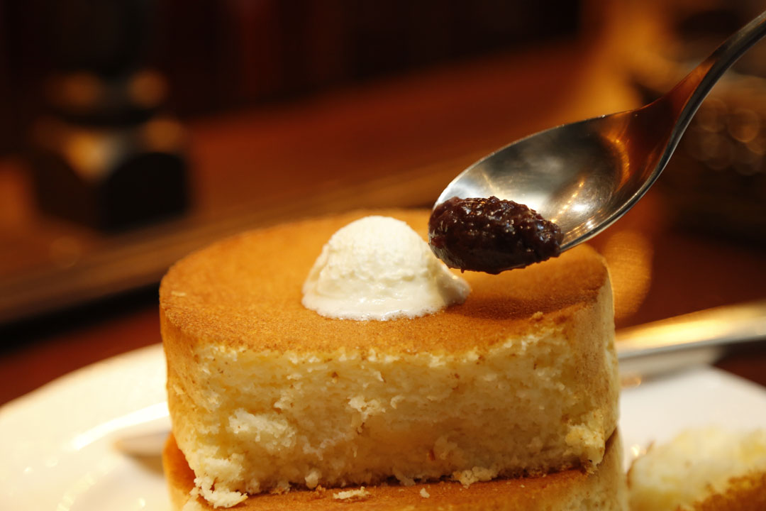 つぶあん、黒蜜、ホイップクリーム。すべて合わせると、また違った魅力の表情を打ち出す「窯焼きスフレパンケーキ」。ワタシは「黒蜜3:つぶあん2」が最強コンビネーションだったけれど、友人はどう?ダブルサイズで注文したからこそ、いろんな味わい方を友達と試して、感想や歓喜を交換し合うのもかなり価値あるひと時よ♡