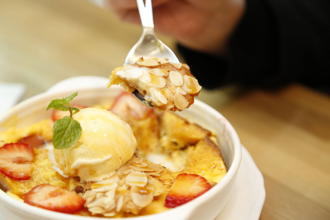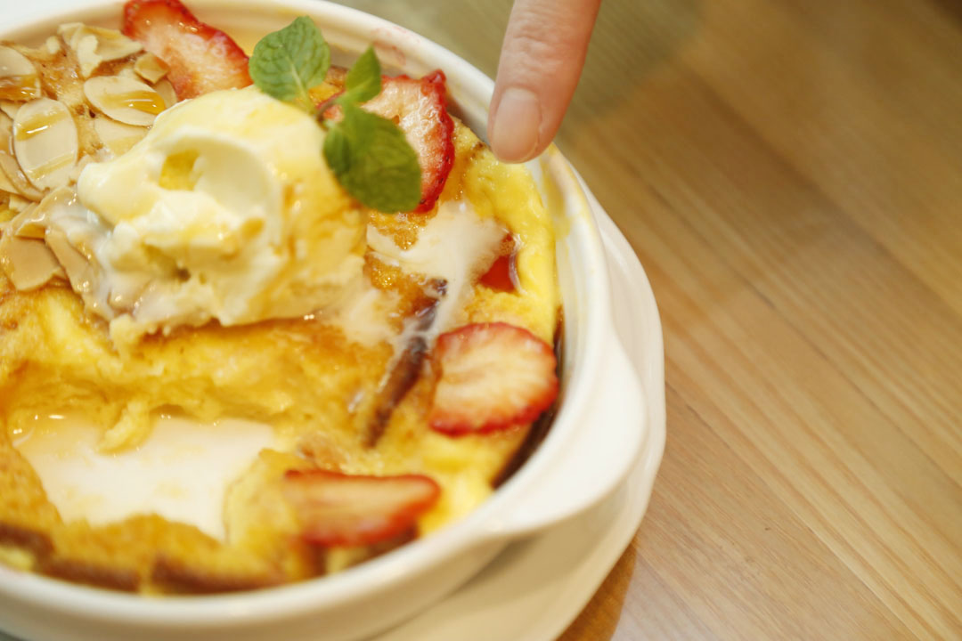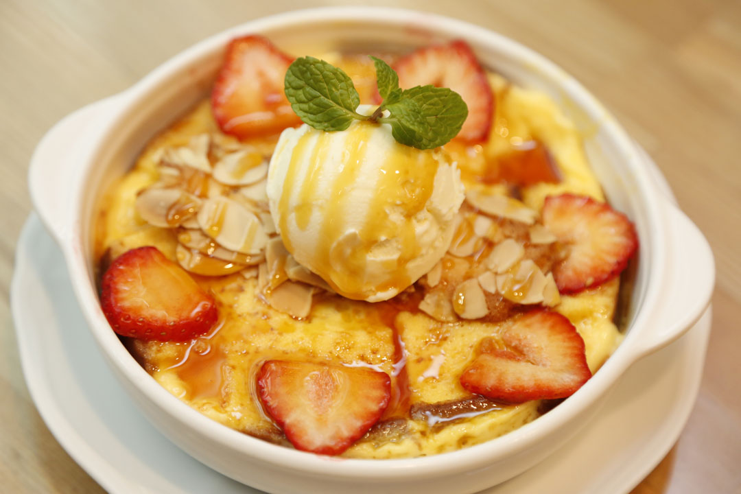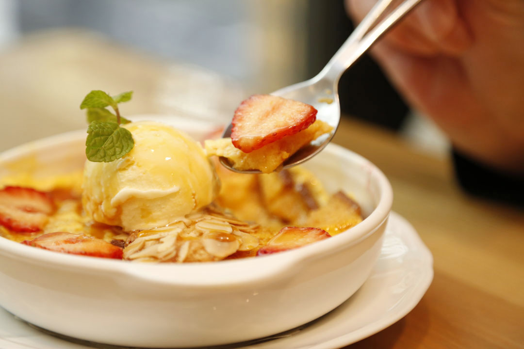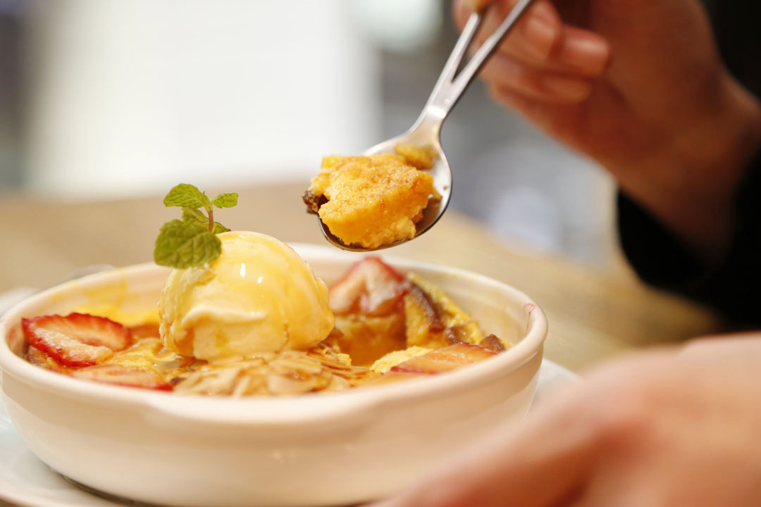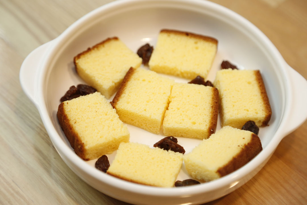 このメニューにはご覧の通りカステラがビッシリと土台になっています。このカステラは、かのCASTE 11(赤箱)を贅沢に使用。エレガントな甘みと素材力が魅力となるカステラのすき間に、ドライレーズンがポロポロと散りばめられて。プリン液をたっぷり注いでオーブンへ!