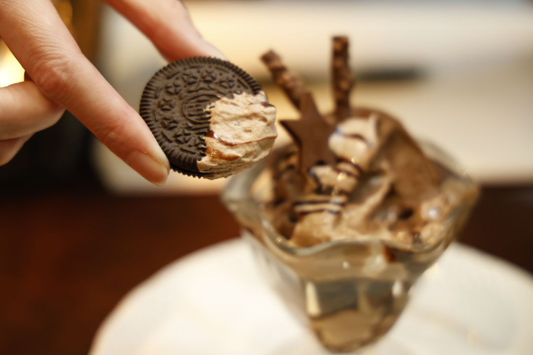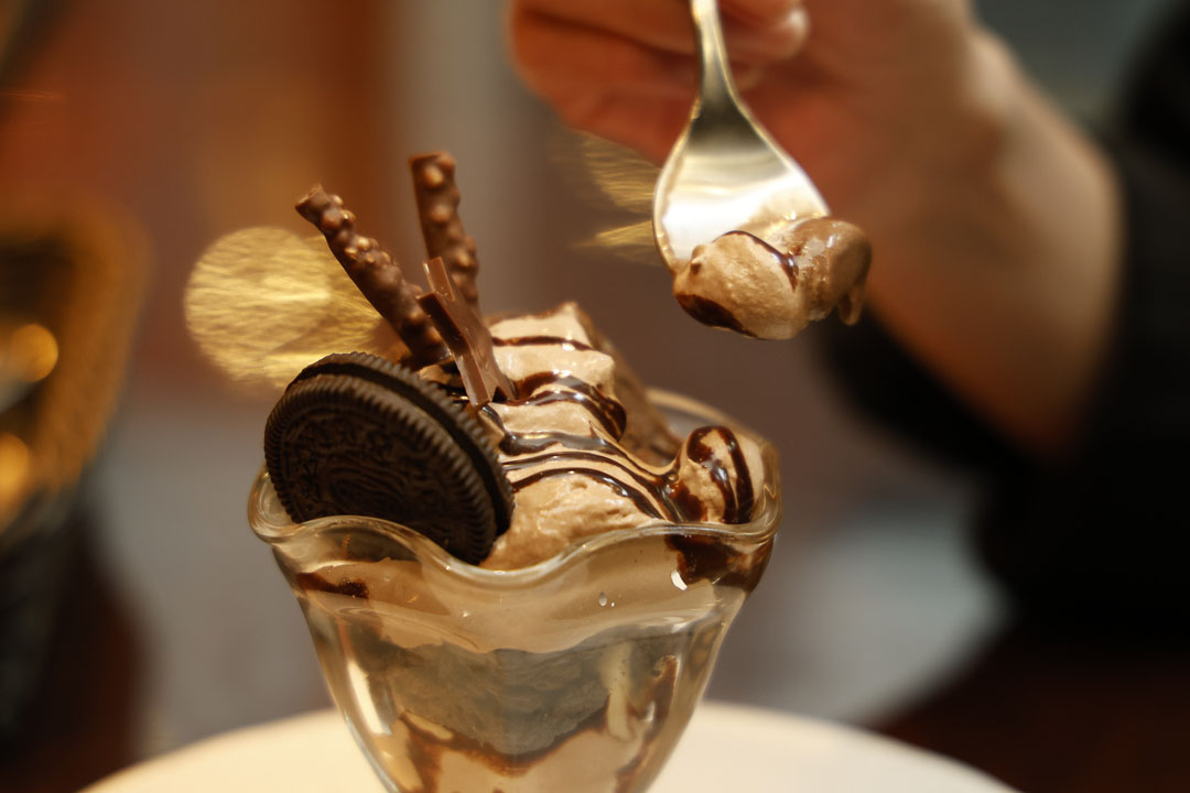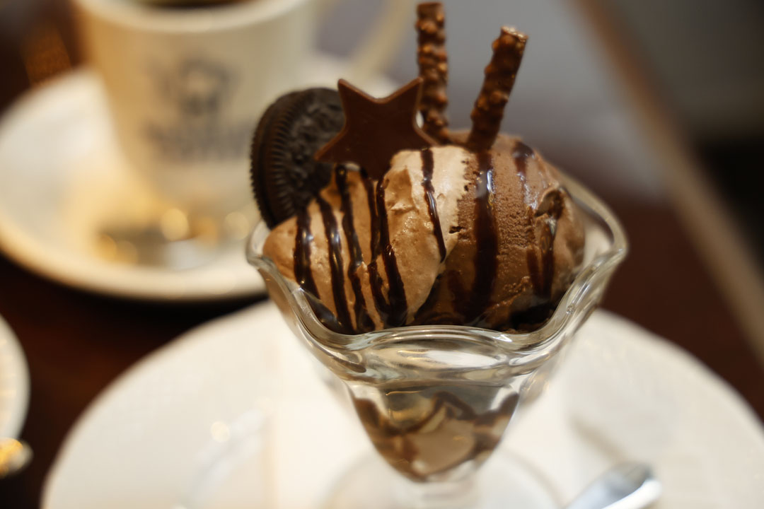 「やっぱりチョコ系を選んだか。あいかわらずだなぁ」と心の中でニンマリ。「チョコレートパフェ」はチョコクリームにチョコアイスが山盛りの魅惑♡