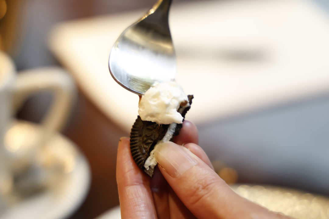 「昭和のプリン」のクリームをチョコサンドクッキーにつけてみたり。