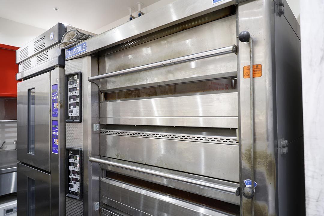 生地発酵のためのホイロ(発酵機)(左)、焼き上げのためのオーブン(右)が設置されており・・・