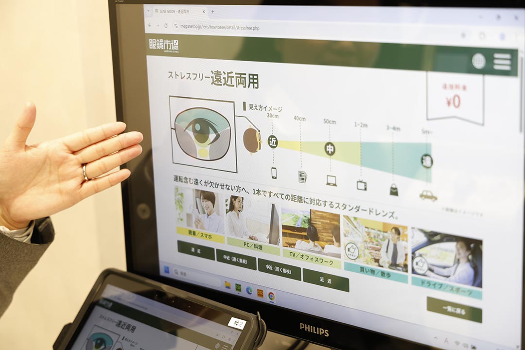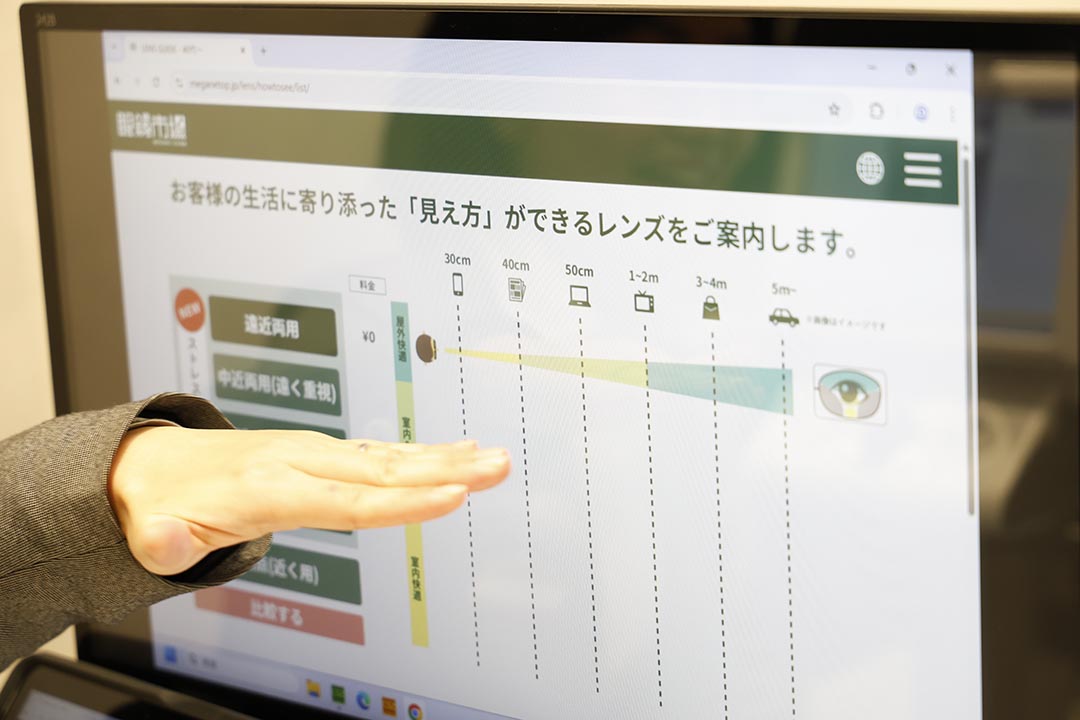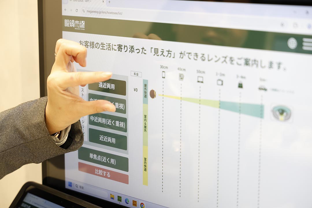 測定を経て、具体的なレンズの体験に移行し、遠くや手元を眺める動作もチェック。