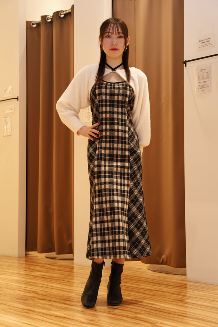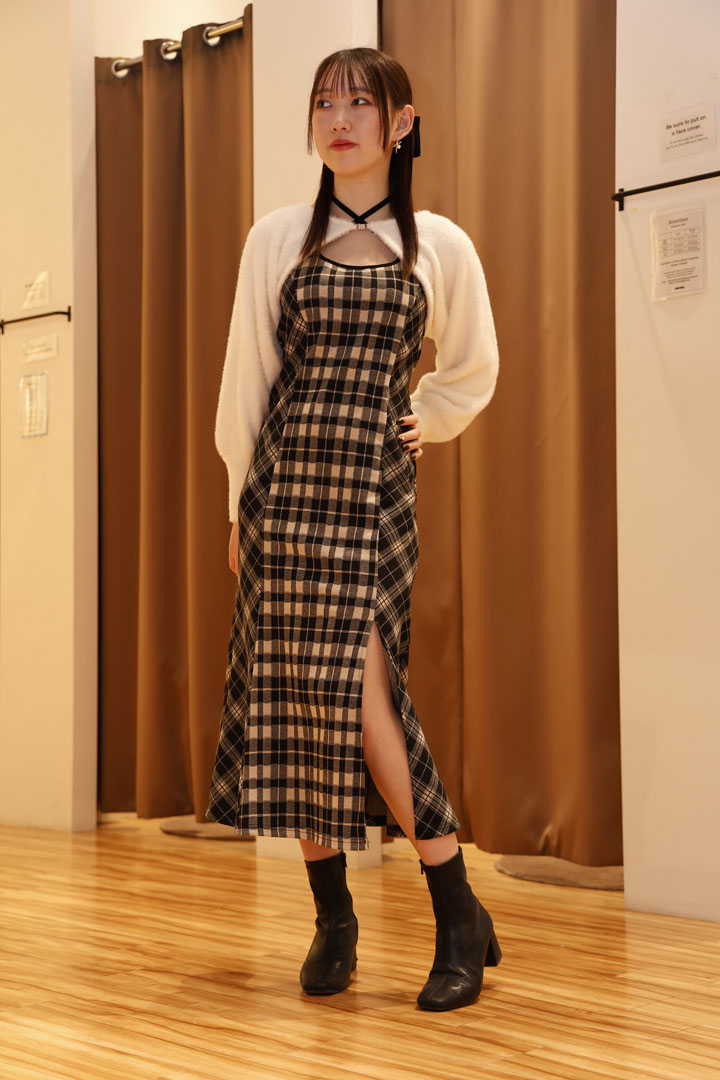 さすがのアヤノさん、ロングワンピを活かしきっています。数種のパターンで組み立てられたチェック生地はウエストラインを美しい曲線に。