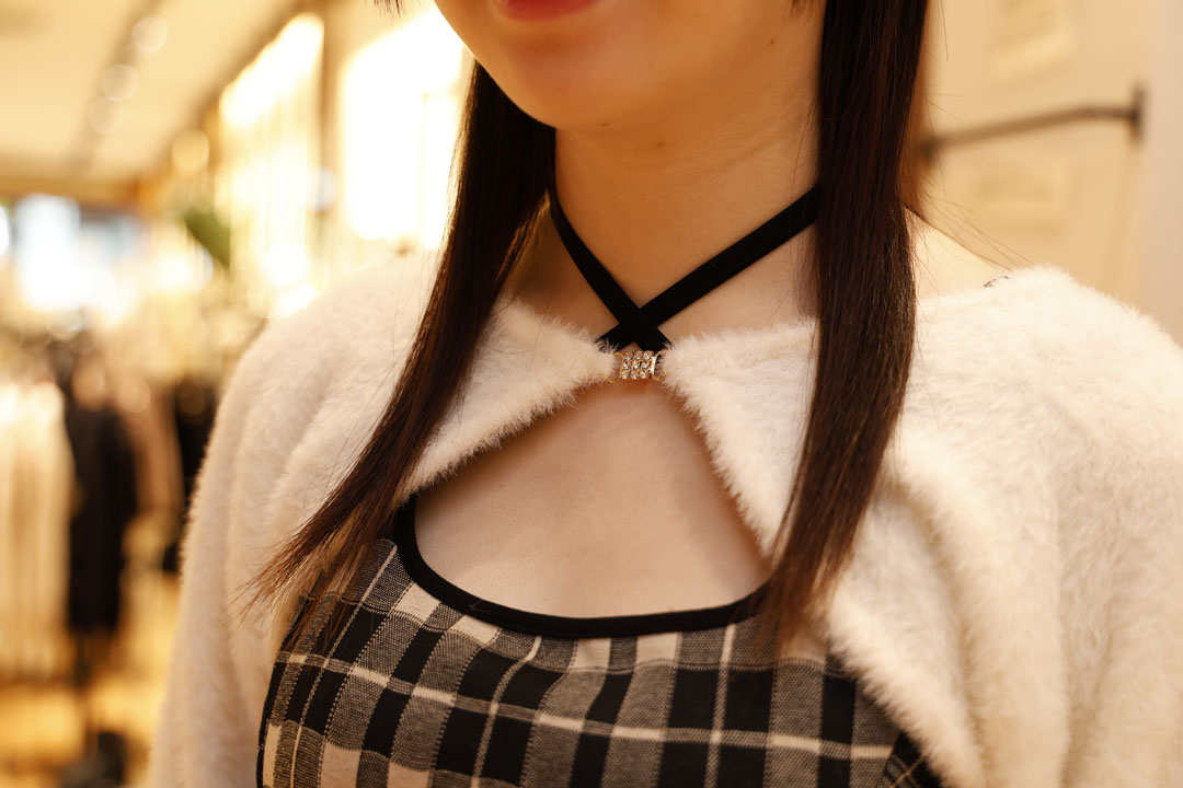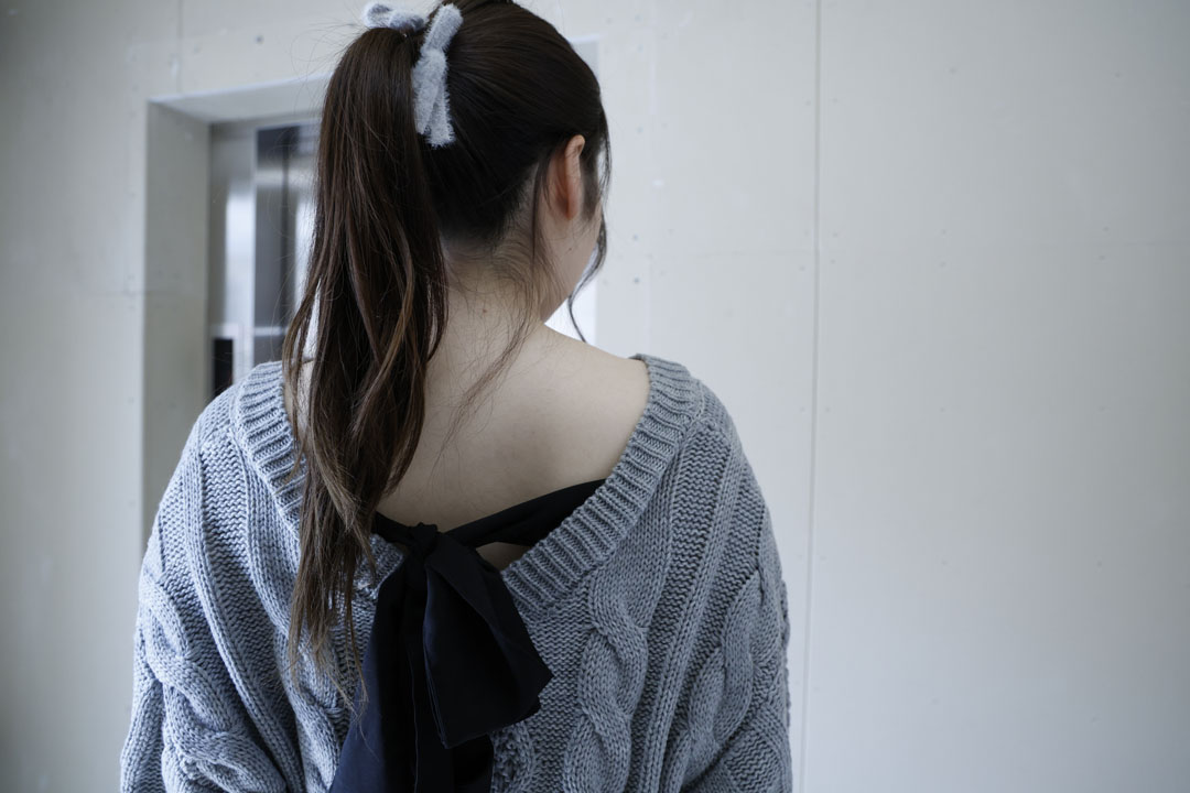 カーディガンの留め位置とワンピースの紐が交差して、程よい肌見せが適います。
