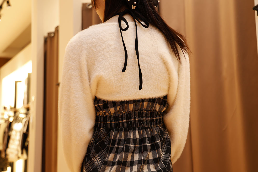 セットとなるボレロ風カーディガンはファー仕様。ノーブルで上品、それでいてスリットを差し込む遊び心も。
