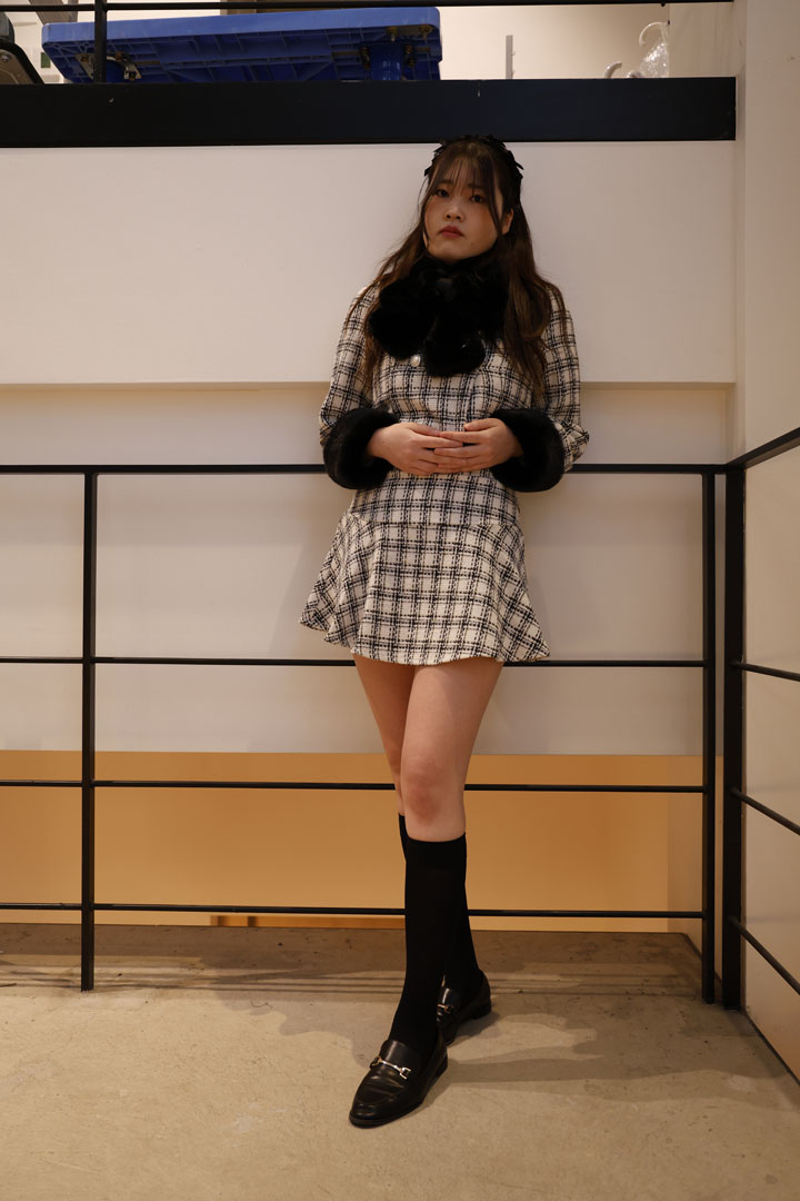 かなりショートなボトム丈にロングソックスを組み合わせる軽妙さ。脚がスッとラインを描く分、首周りティペットと髪型でトップにボリュームを集中。