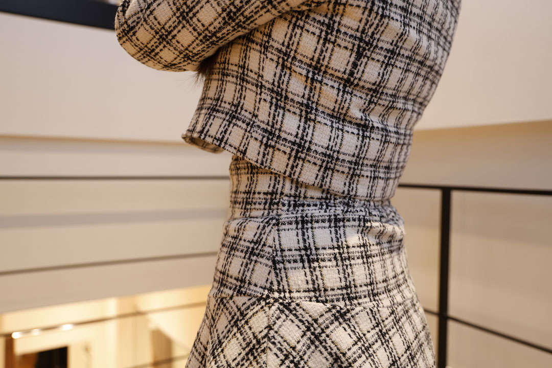 一見フォーマルに映りがちなチェックのセットアップですが、ボディコンシャスラインが◎。