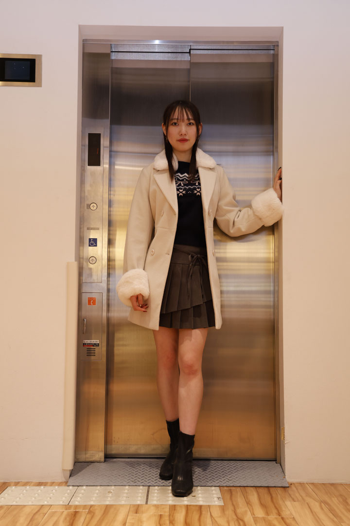 優等生にキメてきたのはアヤノさん。紺ニットとグレースカートは王道のノーブルコンビネーション。そこに白のアウターとあっては隙の無さに拍手です。