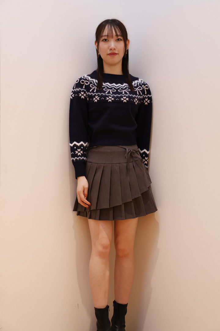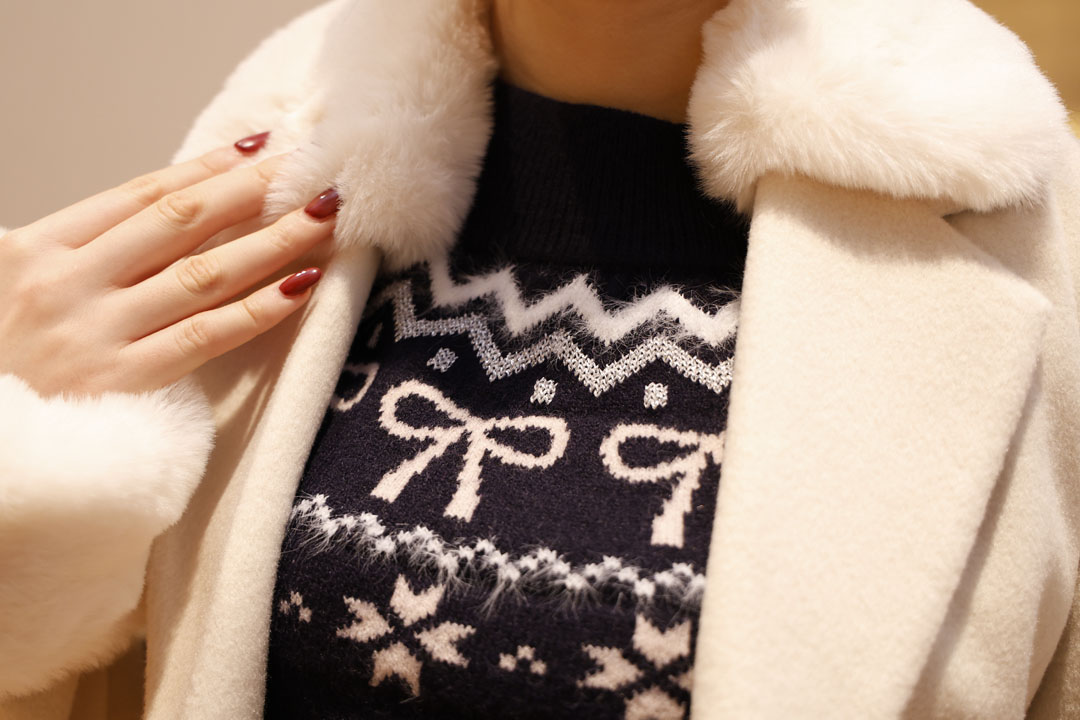 アウターの襟ファーは間違いなくコーデポイント。その合間を飾る北欧ノルディック風のクラシック柄。リボン模様がこれまた可愛い♡