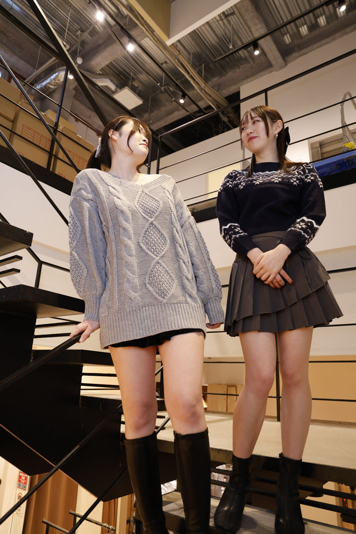 そんなメグとエイミーが並ぶとこの通り!どちらもニット&ミニスカートなのに、そのニュアンスは全く違う。