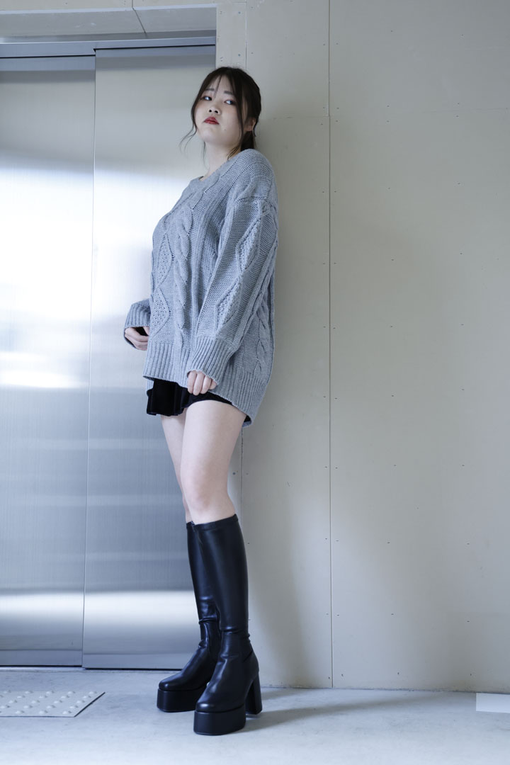 配置カラーを最小限に、甘めのルーズニットにはレザー調のロングブーツでスパイスを効かせて。
