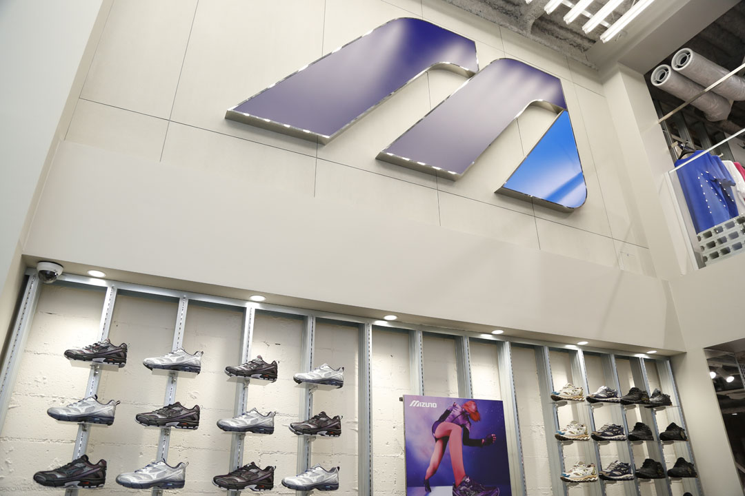 壁面に掲げられるこちらのモノグラム「M」は1980年にCIとして導入し、いまは「ミズノスポーツスタイル」だけで使用しているものとなります。