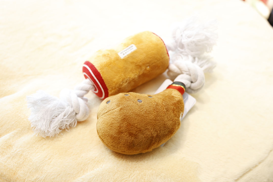 クリスマスシーズンらしい「チキン(モモ)」や「お肉型」の引っ張りおもちゃは大人気。