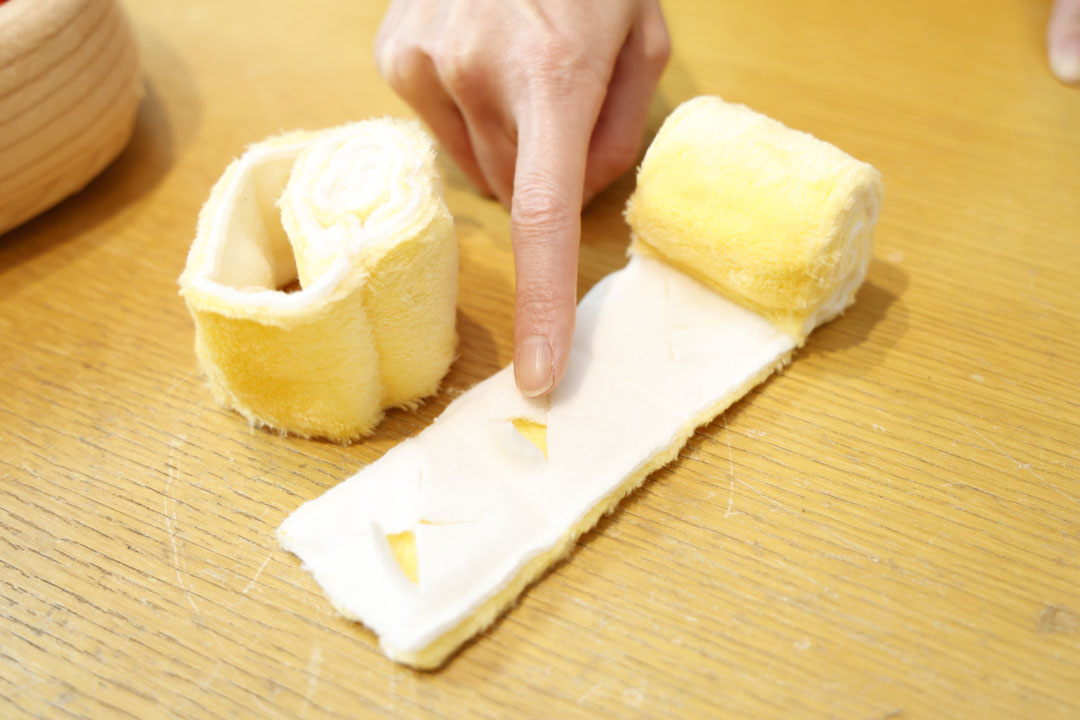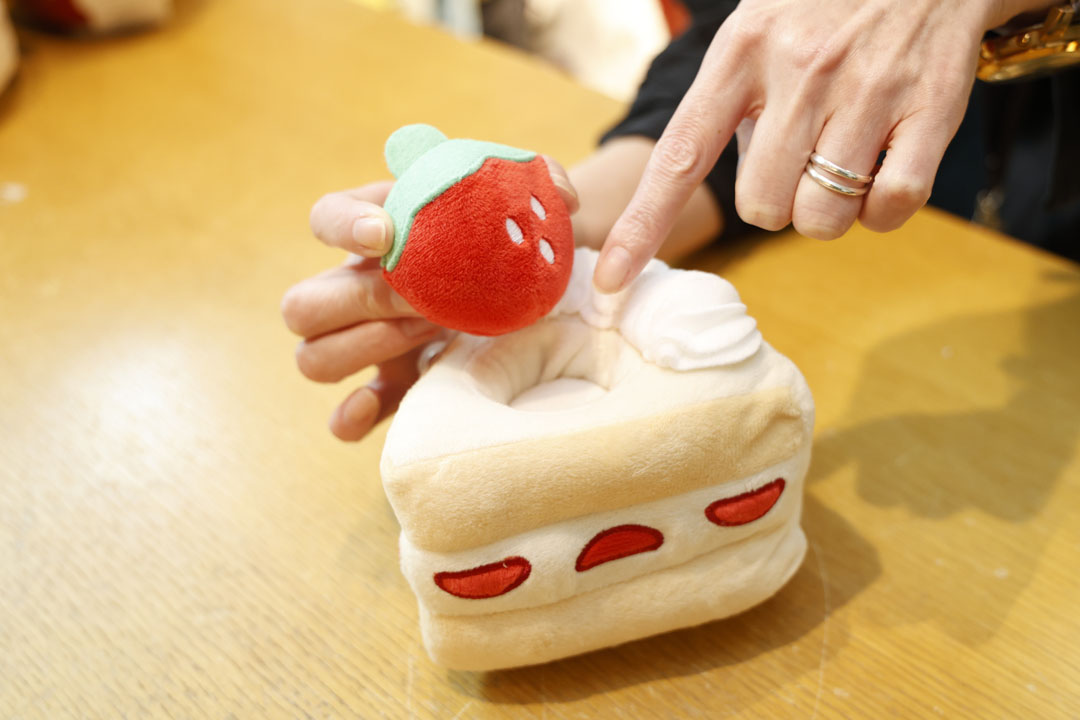ショートケーキのおもちゃでは、イチゴの下にオヤツを隠しておくのも◎