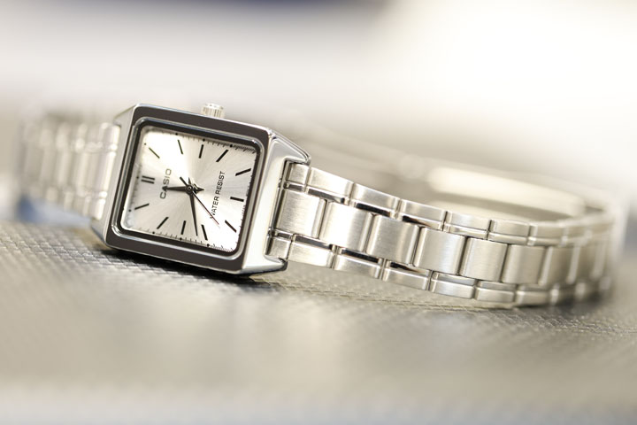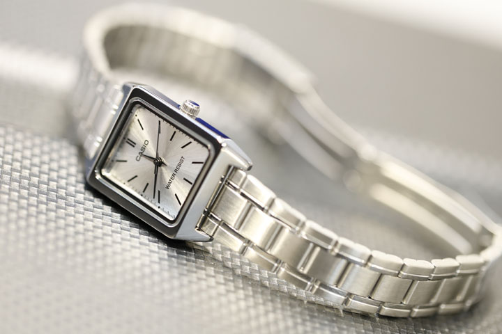 古典的な角型フェイスに華奢なメタリックベルト。クラシカルなドルフィン針に、シンプルなバーインデックス。