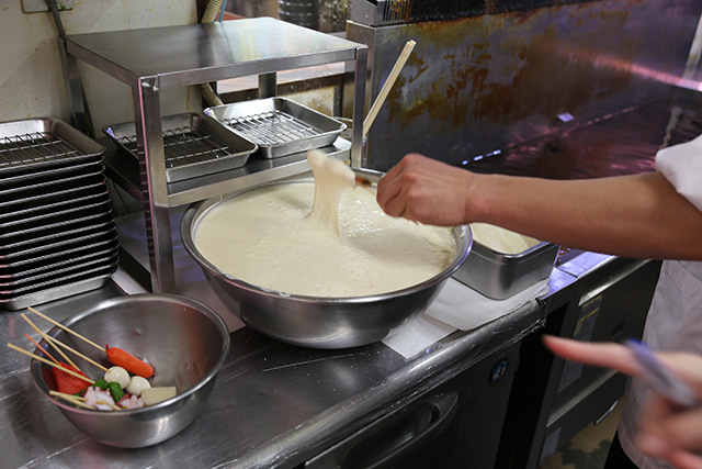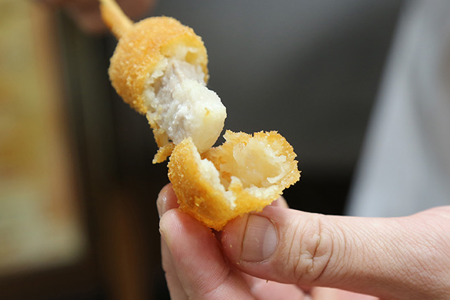 串を持ち上げると「ぬーーーーーーーっ」と伸びる、強粘度な衣。