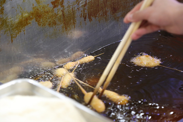 190℃のヘッド油へ。このとき、片時も目を離さず、むしろ、射るように凝視しながら、花菜箸(揚げる箸)を常に動かして串を泳がせ続けるのです。