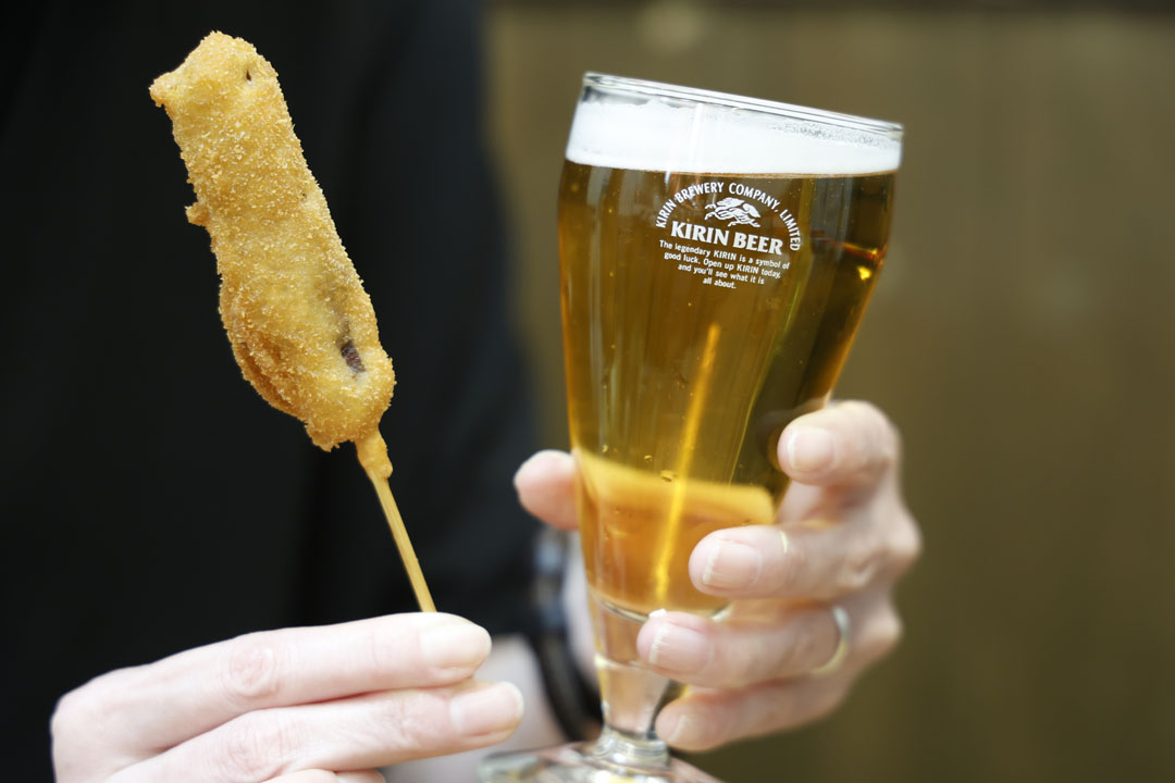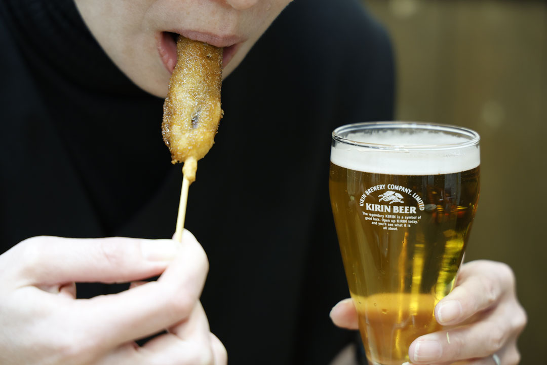 これ、家で缶で飲んだことあるけれど、生で味わえるの???日本産ホップ(奇跡だよ…)を使った香り高いクラフトビールに「元祖串かつ」をぜいたくに、ぜいたくに・・・いただきます。