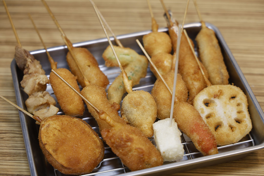 元祖串かつ/天然えび/アスパラ/うずら卵/もち/豚かつ/鶏つくね/赤ウィンナー/チーズちくわ/さつまいも/鶏からあげ/チーズ/名物どて焼き(キムチorえだまめに変更で-110円)