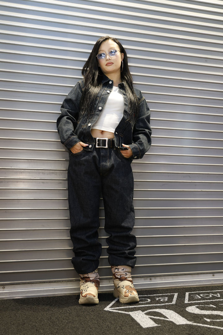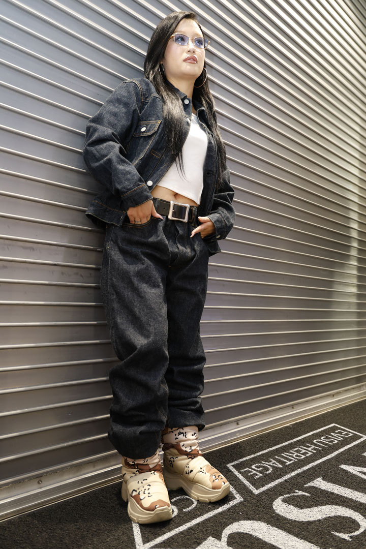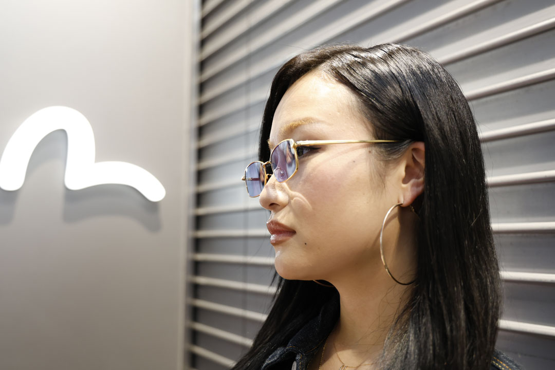 いっぽう、こちらは真っ紺で揃えたデニム×JKスタイル。ご覧の通り、髪の色や肌の色にエッジが効いて、こんな魅力を引き出せるのもEVISUならではのプロダクト。
