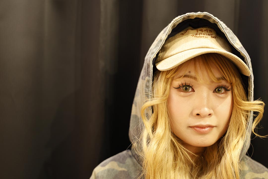 ヘッドはキャップ&フードのレイヤード。縦ラインに重なるデザインを調整するようにフェイスサイドの髪を揺らして。