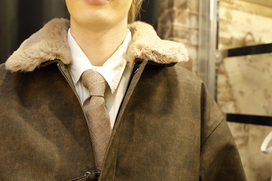 要注意なのはフライトJKです。ここまで無骨でラギットな本格感があるからこそ、タイの遊びが活きるってこと。革の風合いやファーのボリュームをよくよーーくご覧あれ。