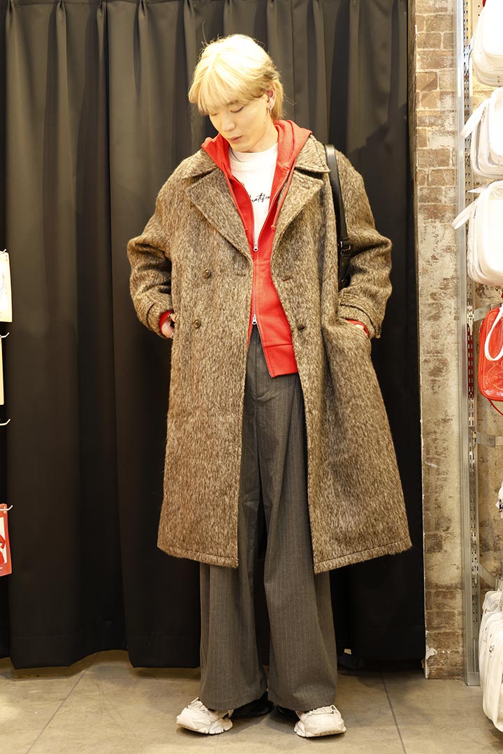 シャギーマテリアルのリッチ感あるチェスターからのぞかせるのは…なんとスウェットの「赤」。