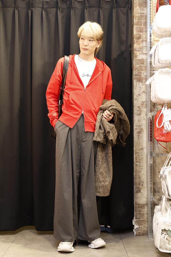 さらにはエレガント味帯びるスラックススタイルとスウェットの対極コンビネーションって、、、、かなり策士な組み合わせ。